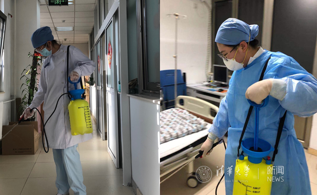 一附院的医护人员对医院室内环境进行消毒作业